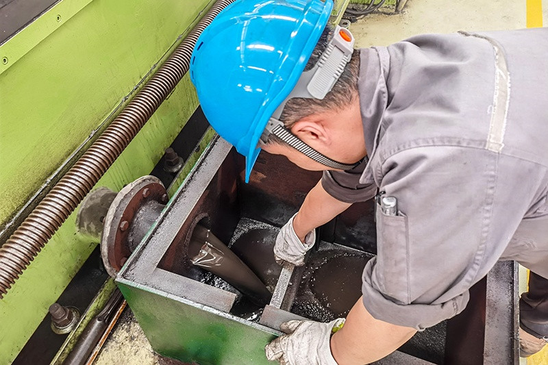 此外,該設備原理是通過內(nèi)注油的方式提高產(chǎn)品內(nèi)外壁光潔度,精密冷加工組在生產(chǎn)過程中發(fā)現(xiàn),該方式不僅會導致工作環(huán)境臟亂,還特別浪費材料。于是,組長馮丹軍帶領(lǐng)班組與公司設備部共同協(xié)作,創(chuàng)新設計了廢油回收系統(tǒng),解決了環(huán)境問題,并且降低了浪費。